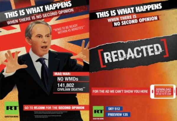 Une campagne de la chaîne russe Russia Today a été interdite dans la capitale britannique. Ses affiches pointaient le bilan de la guerre en Irak, accompagné du message : voilà ce qui arrive quand les médias disent tous la même chose.