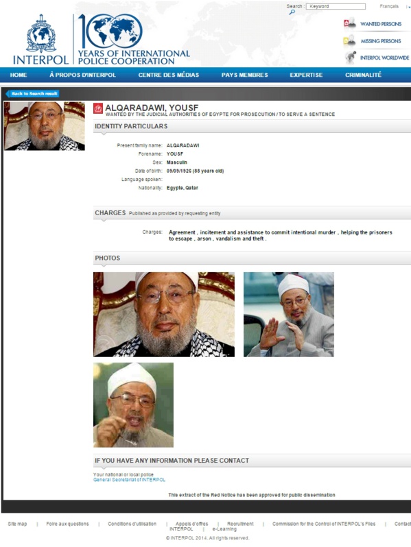 C’est en décembre 2013 que le procureur général, Hisham Barakat, a demandé à l’Organisation internationale de police criminelle (Interpol) l’interpellation du prédicateur intégriste, Youssef Qaradaoui. Cette demande vient d’aboutir : le général Sayad Chafik, adjoint du ministre égyptien de l'Intérieur pour les affaires de sécurité publique, vient déclarer qu’outre le mufti de l’OTAN, 42 autres hauts cadres des Frères musulmans sont désormais recherchés par Interpol pour des crimes graves commis en Egypte entre 2011 et 2013.